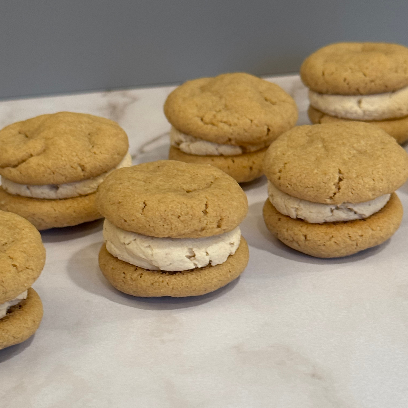 These mini sammies are our delicious peanut butter cookies with our peanut butter buttercream in the middle.